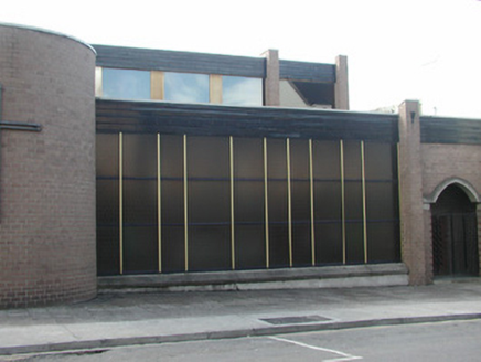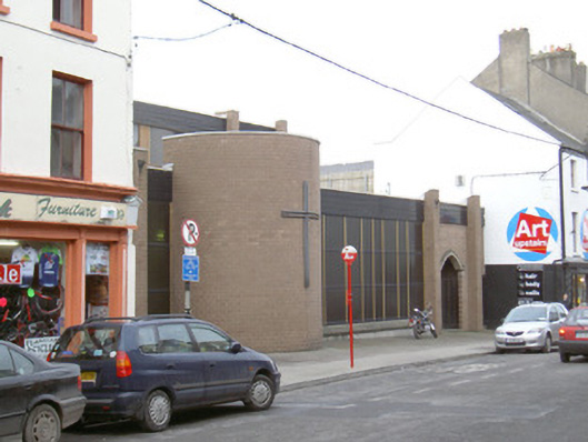Attached multiple-bay single-storey Catholic church, built 1972-3, to designs by Pearse McKenna (1917-2002) on an oblong plan with semi-circular apse and single-storey cloister linking to chancel of original church (1845-8). Flat roof with mono-pitched roof to sanctuary. Purpose-made pink calcium silicate brick walls with stained horizontally-sheeted timber friezes and patent sheet metal coping. Square-headed window openings with fixed-pane fittings. Abstract pointed-arch open porch with insitu concrete arch leading to inset hardwood double doors. Interior with exposed steel beam trussed roof. Street fronted.