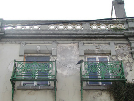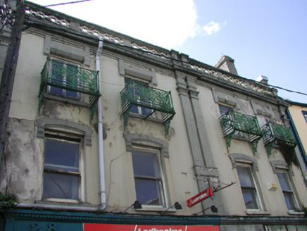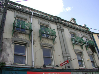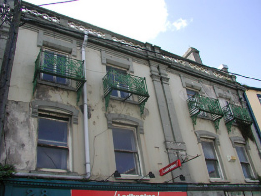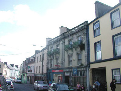 Attached pair of two-bay three-storey rendered properties, built c. 1900. Shopfronts to ground floor, residential use above. Pitched slate roof set behind moulded and pierced stone parapet, unpainted smooth-rendered corbelled chimneystacks. Painted smooth-rendered walling, giant order pilasters, moulded cornice to parapet. Square-headed window openings, projecting moulded decorative arches, painted masonry sills, painted one-over-one timber sash windows to first floor, painted timber casement windows to second floor, decorative cast-iron bracketted balconies to second floor windows. Painted timber shopfronts, cast-iron colonettes flanking door openings, slender paired pilasters flanking centrally-divided display windows each with fretwork ventilation panel over, plain fascia with dentilled cornice. Street fronted.