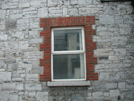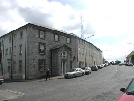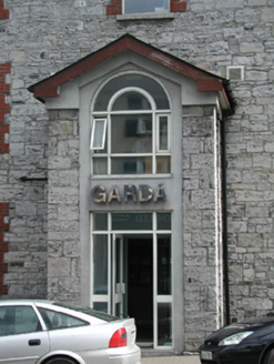 Attached corner-sited three-bay three-storey former Royal Irish Constabulary barracks, built 1848, now in use as Garda Station. Extensively refurbished 1995. Projecting gable-fronted single-bay two-storey entrance porch to west elevation. Hipped artificial slate main roof, pitched roof to porch, clay hip and ridge tiles, smooth-rendered chimneystack to south, cast-iron gutters on overhanging eaves. Random rubble limestone walling to front elevation, straight quoins to corners, projecting plinth. Unpainted smooth-rendered walling to other elevations. Square-headed window openings, red brick block-and-start surrounds, concrete sills, one-over-one uPVC casement windows. Round-headed first floor window opening to entrance porch, uPVC casement window. Square-headed door opening to entrance porch, uPVC door in glazed screen. Street fronted, at busy intersection opposite courthouse.