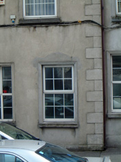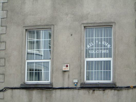 End-of-terrace two-bay three-storey rendered house, built c. 1830, now in use as solicitor's premises and amalgamated with building to south with original door opening converted to window c. 1990. One of a group of six. Attached to neighbouring property to north. Pitched artificial slate roof set behind pedimented gable, artificial ridge tiles, lead-lined valleys. Unpainted smooth-rendered walling, raised render quoins, moulded ashlar limestone surround to pediment having acroteria with carved limestone urns. Square-headed window openings, slightly-raised flat render surrounds, limestone sills, uPVC casements c. 1990. Street fronted, slightly projecting, terminating a group with similarly pedimented building at south end of terrace.