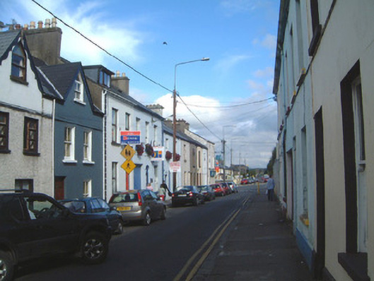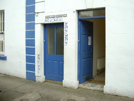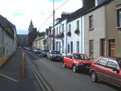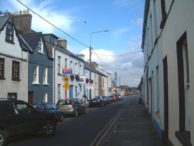 Terraced two-bay two-storey rendered house, built c. 1890, with secondary entrance door immediately to west of principal entrance. Pitched artificial slate floor, artificial ridge tiles, painted smooth-rendered corbelled chimneystack, extruded profiled aluminium rainwater goods. Painted smooth-rendered ruled-and-lined walling, straight channelled quoins to south end. Square-headed window openings, rudimentary moulded keystones, painted stone sills, painted two-over-two timber sash windows. Square-headed door openings, plain-glazed overlight to east, painted timber panelled door to east c. 1980, painted timber panelled and half-glazed door to west c. 1980. Street fronted.
