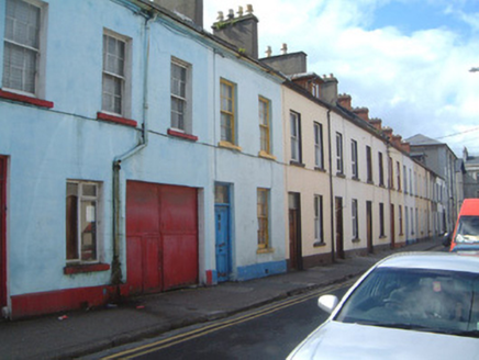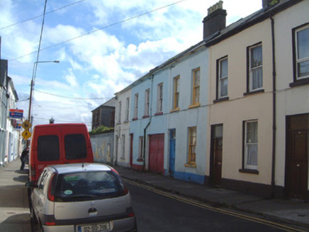 Terraced two-bay two-storey rendered house, built c. 1830. One of a group of twelve. Pitched artificial slate roof, artificial ridge tiles, unpainted smooth-rendered chimneystack, patent roof window c. 1990, moulded cast-iron gutters on eaves corbel course. Painted smooth-rendered ruled-and-lined walling, projecting plinth. Square-headed window openings, painted stone sills, painted six-over-six timber sash windows. Square-headed door opening, plain-glazed overlight, painted four-panel timber door. Street fronted.