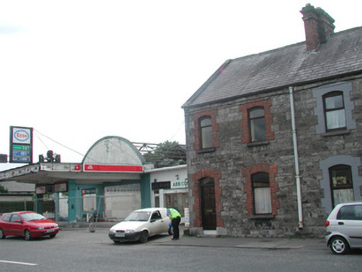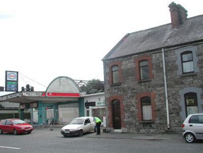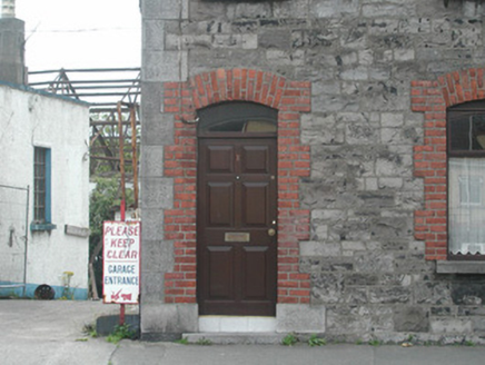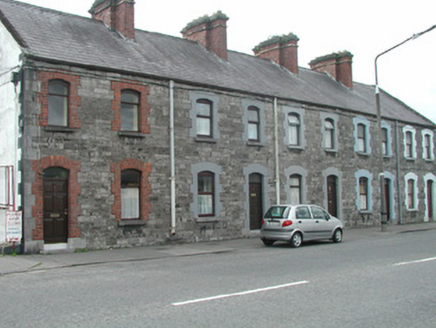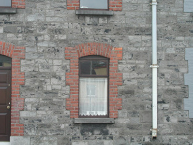 End-of-terrace two-bay two-storey stone house, built c. 1890. One of a group of five. Pitched slate roof, roll-top clay ridge tiles, red brick chimneystack with moulded stone corbelling, stone verges, moulded cast-iron gutters, rectangular cast-iron downpipes. Squared and coursed rubble limestone walling to east elevation, tooled and margined ashlar limestone quoins, painted smooth-rendered walling to south gable. Segmental-headed window openings, red brick block-and-start surrounds, limestone sills, painted timber casement windows c. 1990. Segmental-headed door opening, red brick block-and-start surround, plain-glazed overlight, painted timber panelled door c. 1980, limestone step. Street fronted.