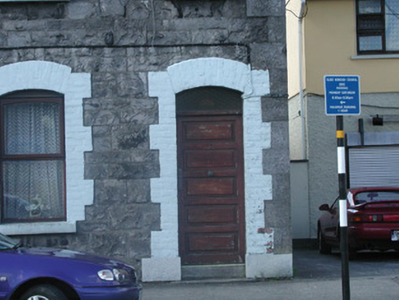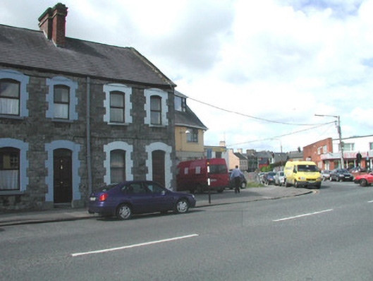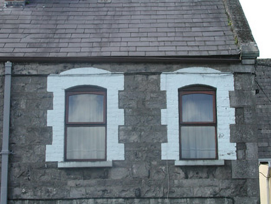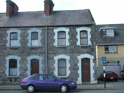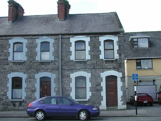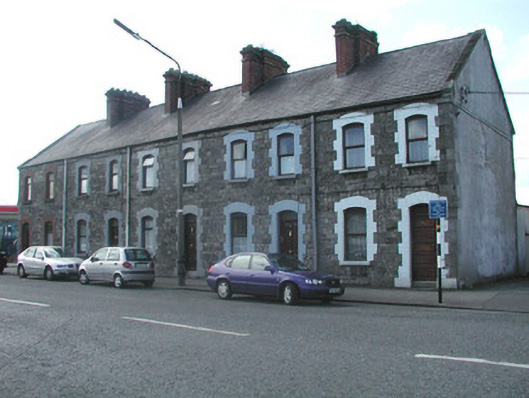 End-of-terrace two-bay two-storey stone house, built c. 1890. One of a group of five. Pitched slate roof, roll-top clay ridge tiles, red brick chimneystack with moulded stone corbelling, stone verges, moulded cast-iron gutters, rectangular cast-iron downpipes. Squared and coursed rubble limestone walling to east elevation, tooled and margined ashlar limestone quoins, painted smooth-rendered walling to north gable. Segmental-headed window openings, painted brick block-and-start surrounds, painted limestone sills, painted timber casement windows c. 1990. Segmental-headed door opening, painted brick block-and-start surround, plain-glazed overlight, painted timber panelled door c. 1980, limestone step. Street fronted.
