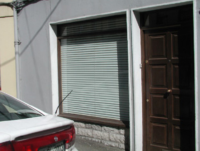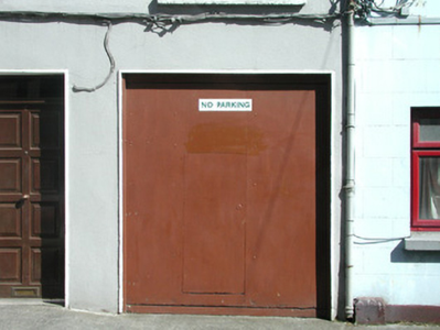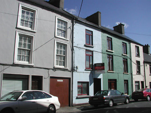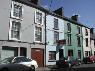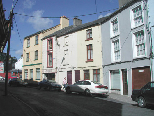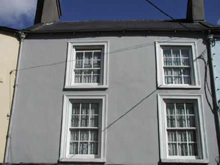 Terraced two-bay three-storey rendered house, built c. 1840, shop at ground floor c.1970, integral carriage arch to south. Pitched slate roof, unpainted smooth-rendered corbelled chimneystacks, half-round cast-iron gutters on drive-in brackets on eaves corbel course, cast-iron downpipes with hoppers. Painted smooth-rendered walling. Square-headed window openings to first and second floors, moulded architraves, painted masonry sills, painted six-over-six timber sash windows. Square-headed openings to former shopfront, slightly-projecting smooth-rendered reveals, painted timber display window, painted timber panelled door. Square-headed opening to carriage arch, slightly-projecting smooth-rendered reveals, steel-sheeted door incorporating wicket gate. Street-fronted.