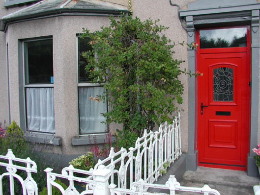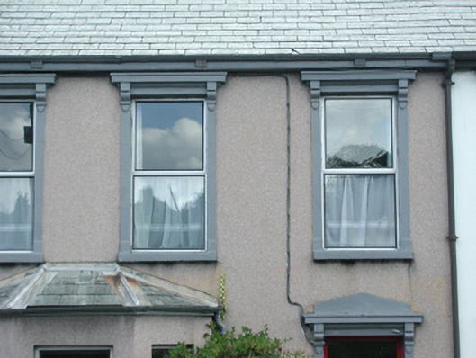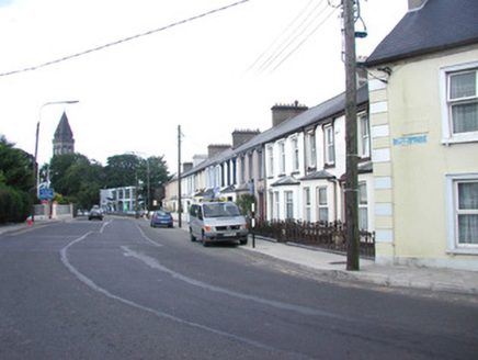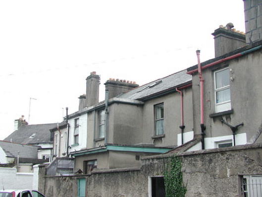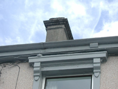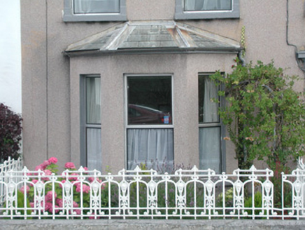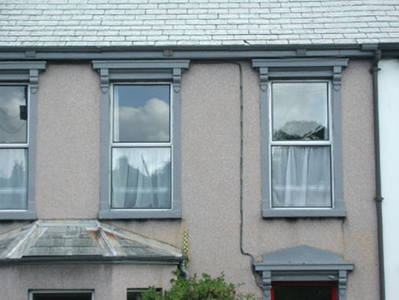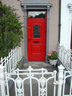 Terraced three-bay two-storey rendered house, built 1914. One of a group of eleven. Canted bay window to north-west of entrance. Pitched slate roof, clay ridge tiles, unpainted smooth-rendered corbelled chimneystack, moulded cast-iron gutters on projecting painted timber eaves. Hipped slate roof to bay, lead wood-cored rolls to hips, moulded cast-iron gutters. Dry-dash walling, projecting plinth. Square-headed window openings, narrow flanking pilasters, moulded corbels carrying flat cornice, painted masonry sills, aluminium casement windows c. 1990. Square-headed door opening, narrow flanking pilasters, moulded corbels carrying flat cornice surmounted by vestigial pediment, uPVC door and plain-glazed overlight c. 2002. Set back slightly from pavement, decorative wrought- and cast-iron railings on unpainted masonry plinth wall.