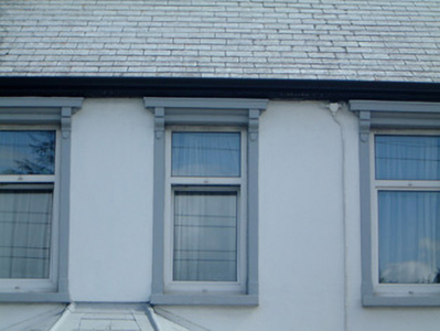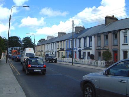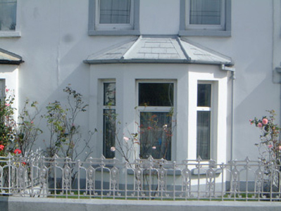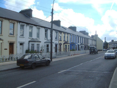 Terraced three-bay two-storey rendered house, built 1914. One of a group of eleven. Canted bay window to north-west of entrance. Pitched slate roof, clay ridge tiles, unpainted smooth-rendered corbelled chimneystack, moulded cast-iron gutters on projecting painted timber eaves. Hipped slate roof to bay, lead wood-cored rolls to hips, uPVC gutters. Painted smooth-rendered walling, projecting plinth. Square-headed window openings, narrow flanking pilasters, moulded corbels carrying flat cornice, painted masonry sills, uPVC casement windows. Square-headed door opening, narrow flanking pilasters, moulded corbels carrying flat cornice surmounted by vestigial pediment, hardwood panelled door c. 1990, plain-glazed overlight. Set back slightly from pavement, decorative wrought- and cast-iron railings on painted masonry plinth wall.