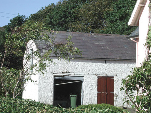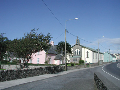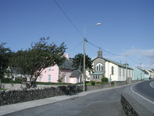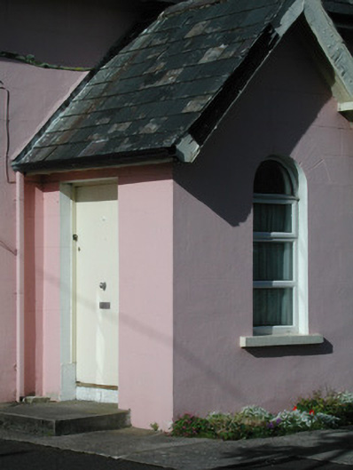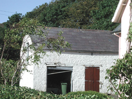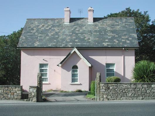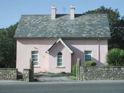 Detached three-bay single-storey with attic rendered former Parochial House, built c. 1900. T-plan, two-bay two-storey return, projecting gable-fronted entrance porch at centre of front (south) elevation. Pitched slate roofs, clay ridge tiles, painted smooth-rendered chimneystacks, profiled extruded aluminium gutters on overhanging painted timber fascias, projecting painted timber bargeboards. Painted ruled-and-lined smooth-rendered walling. Square-headed window openings, painted masonry sills, uPVC casement windows to south elevation, painted two-over-two timber horizontally sub-divided sash windows to gables. Round-headed window opening to entrance porch, uPVC casement window. Square-headed door opening, painted timber flush door, single step. Set in grounds, gravel area to front, garden to rear, rubble stone pitched roof outbuilding to rear.