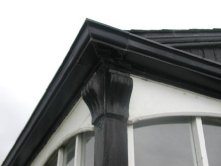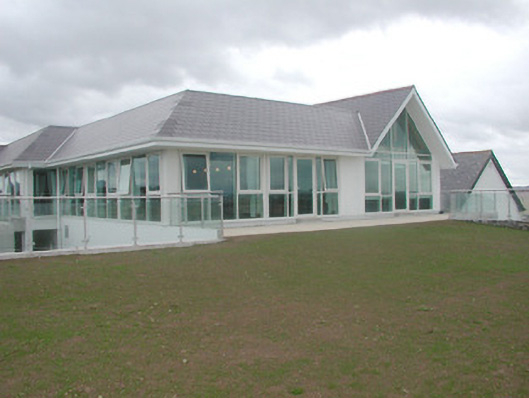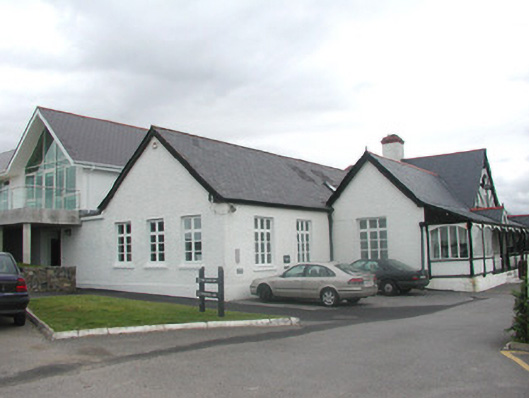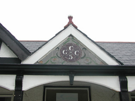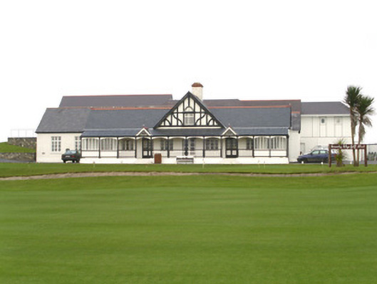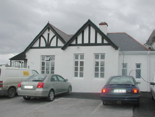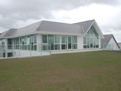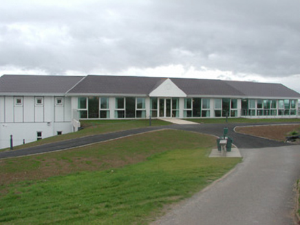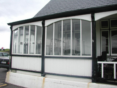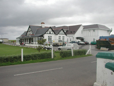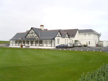 Detached multiple-bay single-storey rendered golf clubhouse, built 1894. Two contiguous east-west ranges, twelve-bay front range (south) fronted by verandah, central four-bay gabled attic, flanked by gablets on verandah roof, extensive single- and two-storey extensions c. 2004 to north. Pitched slate roofs, red clay ridge tiles, painted roughcast corbelled chimneystack, painted timber bargeboards, finials, moulded cast-iron gutters to verandah. Painted roughcast walling, painted timber strapwork to gables. Square-headed window openings, flush sills, painted timber transomed and mullioned casement windows with three panes to lower lights. Square-headed window opening to attic, painted timber flanking pilasters carrying moulded cornice on corbels, semi-circular fanlight over. Stained glass leaded-lights with club emblem in gablets. Segmental-headed openings to verandah, painted square timber posts with fluted corbels carrying roof beam, two bays to either end infilled with painted timber five-pane fixed lights over vertically-sheeted panels, painted timber open balustrade, steps to entrance openings below gablets. Square-headed door openings within verandah, painted timber double doors each with ten-pane upper panel over single panel, plain-glazed overlight. Set in golf course grounds, overlooking Rosses Point.