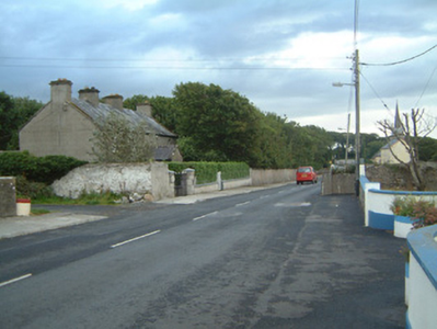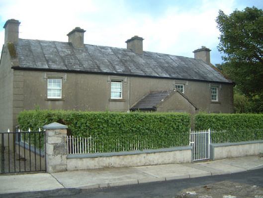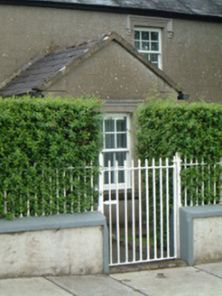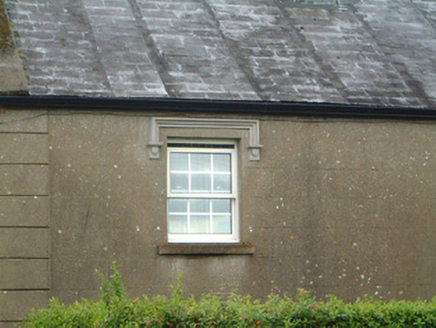 Detached four-bay two-storey rendered house, built c. 1900. L-plan, gable-fronted single-storey porch projecting from north elevation, single-storey wing to rear at south-west. Pitched slate roof with bitumenous felt overlay, clay ridge tiles, smooth-rendered chimneystacks with stepped caps, concrete verges, profiled extruded aluminium gutters on eaves corbel course. Unpainted smooth-rendered ruled-and-lined walling, straight V-jointed quoins. Square-headed window openings, hood-moulds, masonry sills, uPVC sash windows c. 2000. Square-headed door opening to porch, painted timber panelled door. Set back from road, garden, painted smooth-rendered boundary wall, saddle-back copings, wrought-iron round-bar spiked railings and gate, high hedge, double gates to east giving to enclosed yard to rear.