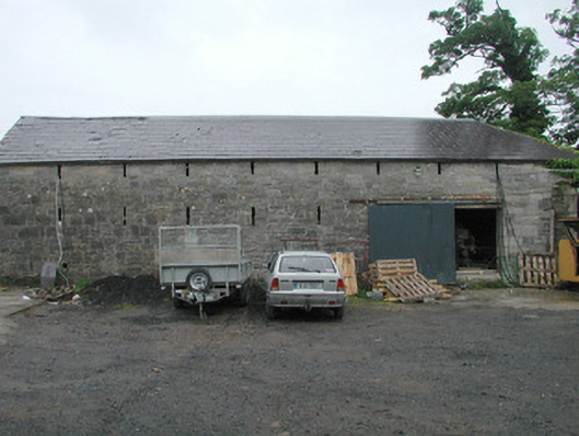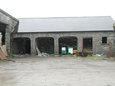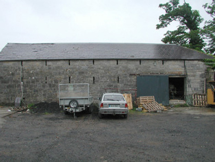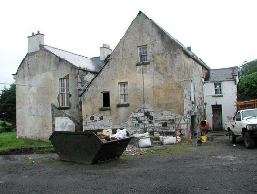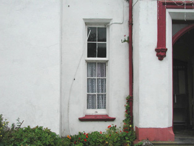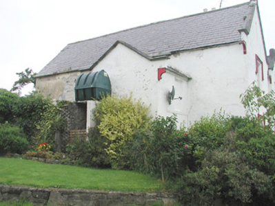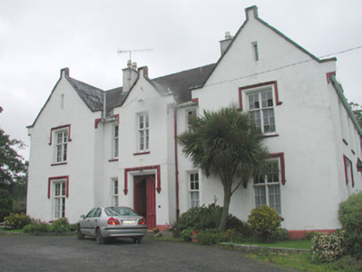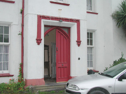 Detached five-bay two-storey with attic rendered house, built c. 1850. Rectangular main block with forward-thrusting gabled end bays, returning as north-east and north-west wings, and central entrance bay. Two-storey gabled projection to west elevation, canted bay window to north end of east elevation. Pitched slate roof, painted smooth-rendered flat-capped chimneystacks, extruded aluminium profiled gutters c. 1990 on eaves corbel course, cast-iron downpipes. Painted smooth-rendered walling, profiled verge copings to south and west gables on slender kneelers on profiled corbels with square caps at apexes, chamfered plinth. Square-headed window openings, hood-moulds with decorative stops to end bays, chamfered reveals, painted moulded sloping sills, painted small-paned transomed and mullioned timber sash windows to south and east elevations, six-over-six sash windows to north elevations. Square-headed door opening, hood-mould with decorative stops, chamfered reveals, glazed spandrels over painted pointed-arched timber double doors each with six moulded panels, single bull-nose stone step to door. Various one- and two-storey pitched roof rubble stone outbuildings to north arranged around two yards. Rubble stone boundary walls enclosing walled garden and extending to neighbouring mill to north-east. Set in extensive grounds, accessed by avenue from south.