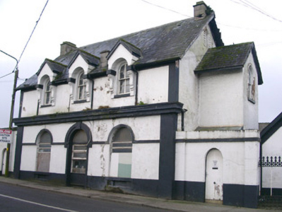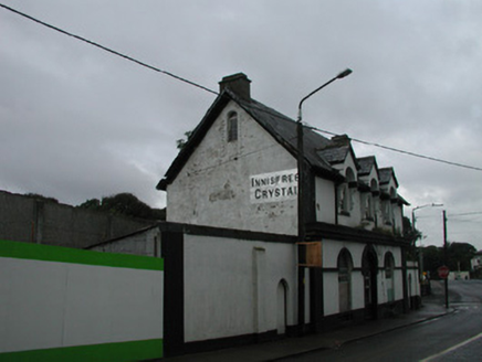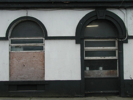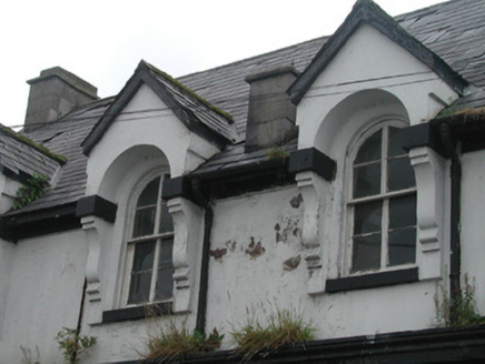 Detached three-bay two-storey with attic rendered house, built c. 1880, now in use as commercial premises. Single-bay two-storey gabled projection from north gable. Pitched slate roofs, dressed stone corbelled chimneystacks to gables, roll-top clay ridge tiles, projecting painted timber barge boards, smooth-rendered gabled dormers to east elevation projecting beyond eaves carried on profiled masonry corbels, cast-iron half-round gutters on projecting painted timber eaves, cast-iron downpipes. Painted smooth-rendered walling, heavily moulded rendered cornice at first floor, moulded impost string course to ground floor. Round-headed window openings to ground floor, plain rendered band around arched heads, painted stone sills, painted timber casement windows c.1970. Round-headed first floor window openings, painted masonry sills, painted four-over-four timber sash windows. Round-headed central door opening, infilled as window c. 1970, plain rendered band surround, moulded keystone. Pointed-arch door opening in single-storey wing to north, painted timber vertically-sheeted door, leading to concrete spiral staircase. Ground floor interior consists of large open space with cast-iron columns. Street fronted, decorative cast-iron railings and painted masonry gate piers to north. Single-storey gabled outbuilding to north, pitched slate roof, painted smooth-rendered walling, central doorway with hood moulding over.