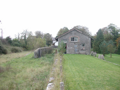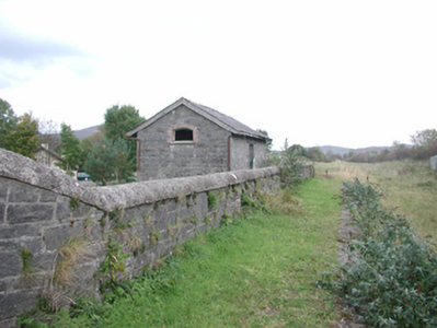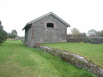 Detached three-bay single-storey stone former railway goods shed, built c. 1860, now disused. Pitched slate roof, clay ridge tiles, cast-iron rainwater goods mainly missing, painted timber overhanging eaves, painted timber projecting barge boards. Coursed squared rubble limestone walling, projecting tooled ashlar quoins. Segmental-arched window opening to south gable, brick dressings, stone sills, painted multi-pane casement windows. Combination of segmental-arched and square-headed window openings to north elevation, limestone dressings to square-headed opening with stone sill and painted two-over-two sash window. Segmental-arched window opening has brick dressings, stone sill and multi-pane casement windows. Square-headed door openings, limestone dressings, raised quoins to door to east elevation, doors missing. Railway track to east now taken up, service road to west, squared rubble stone wall with semi-circular coping parallel to east elevation extends south to station.