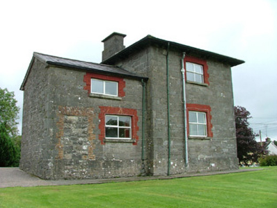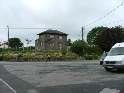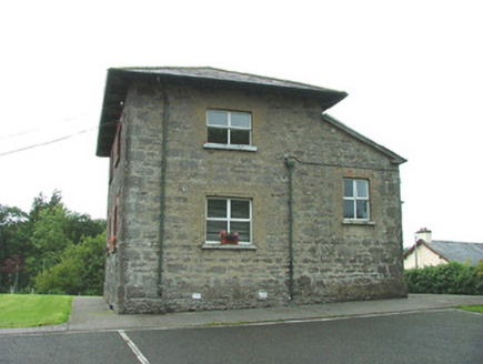 Detached two-bay by one-bay two-storey stone school, built c. 1890. L-plan one-and-a-half storey return building to north. Hipped slate roof, pitched to return, clay ridge and hip tiles, ashlar limestone two-stage corbelled chimneystack on north wall of main block, extruded aluminium gutters on painted timber overhanging eaves carried on paired painted timber profiled corbels, cast-iron downpipes. Uncoursed rubble limestone walling with evidence of original lime render, tooled squared limestone quoins, open-pedimented gable to return. Square-headed window openings, painted block-and-start brick surrounds, dressed limestone sills, uPVC casement windows. Square-headed door opening to return, block-and-start brick surround, hardwood vertically-sheeted door c.2002. Set in own grounds on elevated open site in centre of village, wire roadside fence on stone retaining wall to east and south.