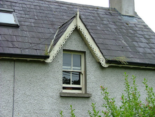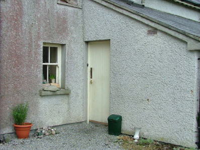 Detached three-bay single-storey rendered house, built c. 1870, with gable-fronted half-dormer attic. Single-storey extension to rear elevation with single-pitched roof c. 1983. Pitched slate roof, clay ridge tiles, unpainted smooth-rendered flat-capped chimneystacks, uPVC rainwater goods, painted timber projecting eaves, painted decorative fretwork timber barges to dormers and gables. Roof lights to both sides of principal pitch roof, c. 1995. Roof light to lean-to extension roof to south. Unpainted roughcast walling, smooth-rendered recessed plinth. Square-headed window openings, unpainted smooth-rendered reveals, masonry sills, painted two-over-two timber sash windows. Square-headed door opening to extension, painted vertically-sheeted timber door. Set back slightly from road behind rubble stone boundary wall, garden to south.