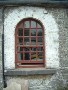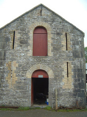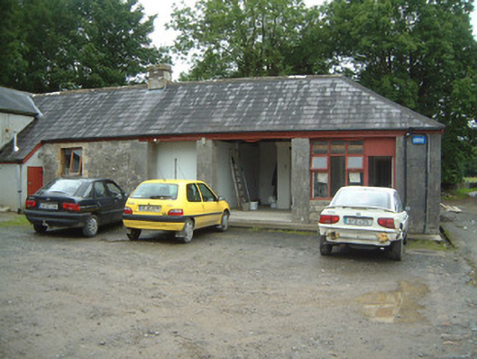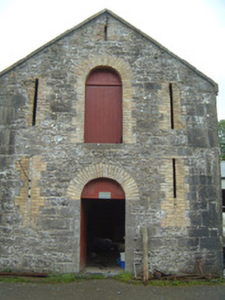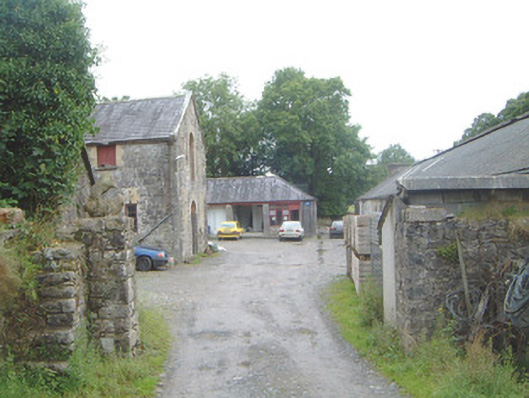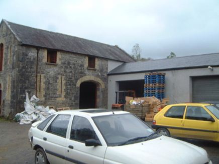 Complex of single- and two-storey stone farm buildings, built c. 1830. Thirteen-bay single-storey range to north running full length of yard, single-storey L-plan lean-to stall buildings to east and south, two-storey gable-fronted projecting block to centre of south side dividing complex into two yards, single-storey range to west, modern single-storey extension linking west range and central block. Now in use as food processing facility. Pitched slate roofs, hipped to west range, corrugated-asbestos to part of north range, clay ridge and hip tiles, smooth-rendered stepped and corbelled chimneystacks, cast-iron rainwater goods, cast-iron columns carrying outer edge of stall buildings. Uncoursed rubble limestone walls, cut limestone quoins, cut limestone verge copings to gables of two-storey block. Round-headed window openings to north range, yellow brick surrounds (some painted), tooled limestone sills, painted twelve-over-eight timber sash windows. Square-headed window openings to central block, block-and-start yellow brick surrounds, limestone sills, vertically-sheeted timber panels, with some cast-iron fixed casements. Round-headed door openings to north range, yellow brick surrounds, spoke wheel fanlights, painted timber panelled doors. Set in grounds of private demesne with walled garden to south, surrounded by mature farmland.