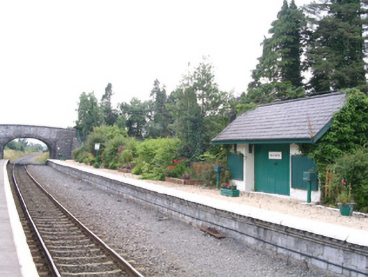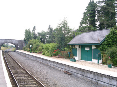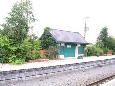 Detached single-storey rendered waiting room, built c. 1875. Now unused. Pitched slate roof, clay ridge tiles, painted timber projecting bargeboards, painted timber overhanging eaves carried on timber gallows brackets, half-round cast-iron gutters. Painted smooth-rendered walling. Rectangular painted vertically-sheeted timber panels to either side of square-headed central opening, painted vertically-sheeted timber doors. Set to west side of west platform with station on opposite side of track and bridge to south.