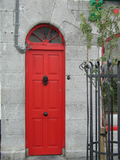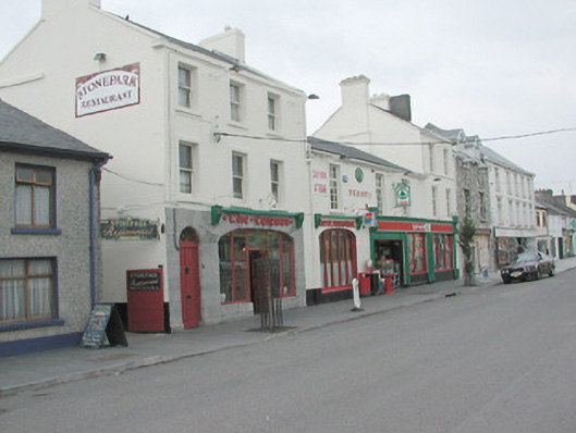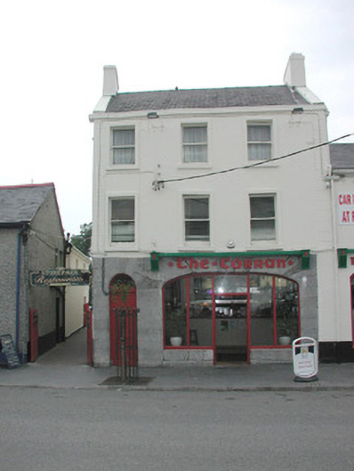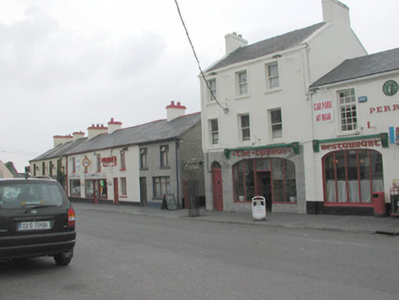 Corner-sited three-bay three-storey rendered house, built c. 1830, now in use as restaurant with dwelling over. Pitched artificial slate roof, clay ridge tiles, painted masonry verges, painted smooth-rendered corbelled chimneystacks, lead-lined painted timber box gutters. Dressed ashlar limestone walling to ground floor, chamfered plinth, painted smooth-rendered ruled-and-lined walling to gable-ends and first floor, painted smooth-rendered V-jointed straight quoins to upper floors. Square-headed window openings to upper floors, painted plain banded surrounds, painted stone sills, painted timber one-over-one timber sash windows. Round-headed narrow door opening to west side of front (south) elevation, tooled ashlar limestone voussoirs, painted timber door with six panels c. 1980, simple sunburst fanlight. Wide segmental-arched opening to shopfront, tooled ashlar limestone voussoirs, ashlar limestone plinth, painted timber display window with central door and overlight c. 1980, individually lettered sign below consoled fascia c. 2000. Street fronted, alleyway to west, lower two-storey contiguous buildings to east.