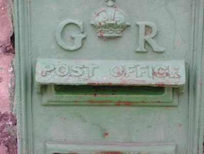 Wall-mounted cast-iron post box, installed c. 1915. Vertical oblong shape, moulded edge, protruding flap embossed 'POST OFFICE' over letter slot, embossed G R insignia with crown, embossed manufacturer's mark 'W T ALLEN & Co. LONDON', hinged access door with slot for collections information plate. Mounted in rubble stone wall at Y-junction.