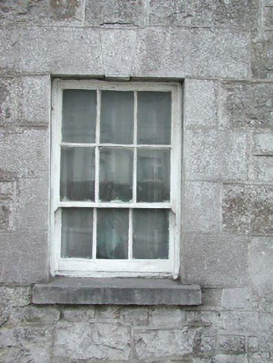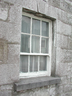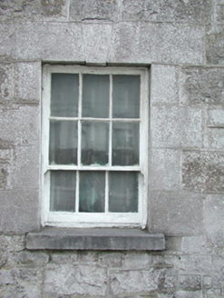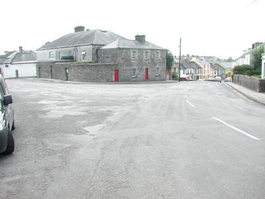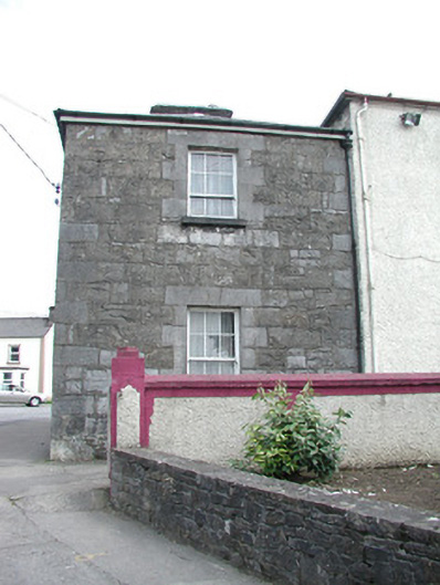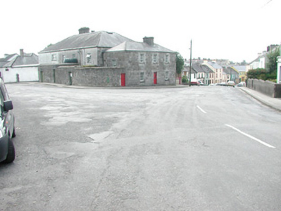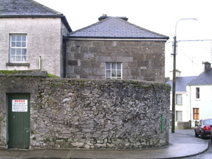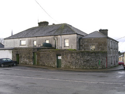 Detached three-bay two-storey stone house, built c. 1830. Hipped slate roof, lead ridge and hip cappings, unpainted smooth-rendered corbelled chimneystack, half-round cast-iron gutters on eaves corbel course. Rock-faced coursed ashlar limestone walling. Square-headed window openings, tooled ashlar limestone surrounds with keystones to lintels, dressed limestone sills, painted six-over-three timber sash windows to both floors. Square-headed door opening, tooled ashlar limestone surround with keystone to lintel, painted timber door with three raised-and-fielded bottom panels and margined glazed top panel c. 1960, limestone steps. Street fronted behind wide pavement, abutting town hall to south, curved rubble stone boundary wall to east, on Y-road junction.
