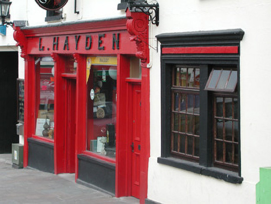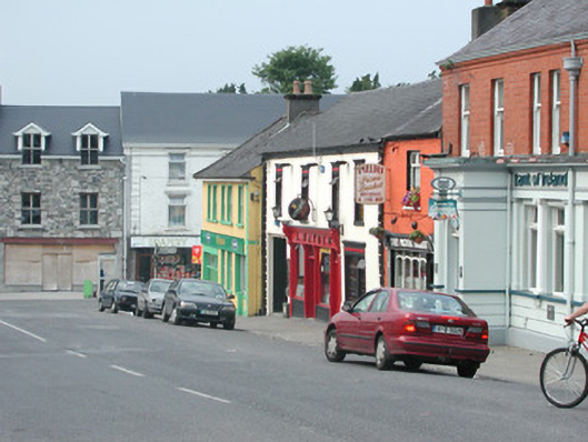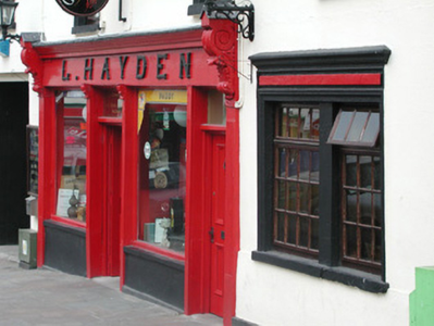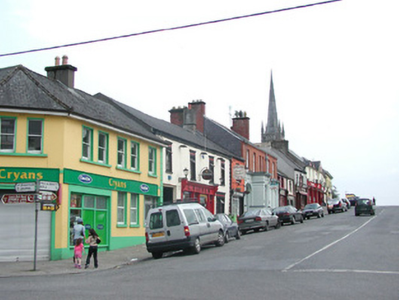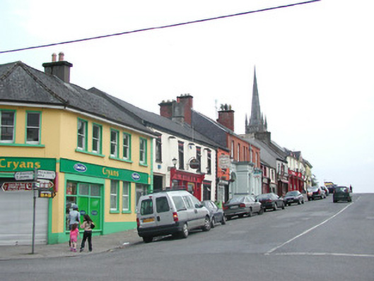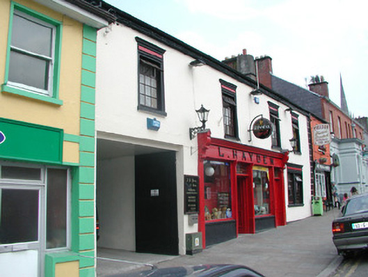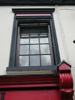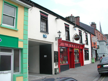 Terraced four-bay two-storey rendered house, built c. 1820, now in use as public house. Integral carriage arch to north, central ground floor pubfront c. 1890. Pitched artificial slate roof c. 1990, clay ridge tiles, unpainted smooth-rendered chimneystack to south, half-round cast-iron gutters on eaves corbel course, cast-iron downpipe. Painted smooth-rendered walling, straight quoins with channeled joints. Square-headed window openings, moulded architraves, recessed frieze panel and moulded cornice over, painted stone sills, painted timber casement windows c. 2000. Painted timber pubfront, fluted pilasters, carved fluted consoles, fascia with raised lettering, lead-capped moulded cornice, square-headed plain-glazed painted timber display windows on stall risers to either side of pub entrance, painted timber double doors each with two panels, plain-glazed overlight with applied licensing details. Square-headed door opening to south side of pubfront providing access to first floor, painted timber door with four panels, plain-glazed overlight. Square-headed carriage arch, painted vertically-sheeted timber double gates. Street fronted on incline with slightly higher building to south and slightly lower building to north, carriage arch leads to rear yard.