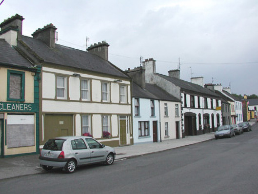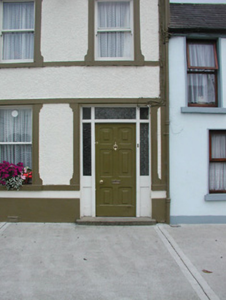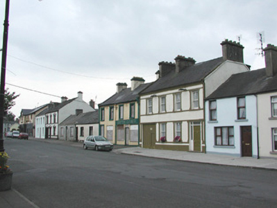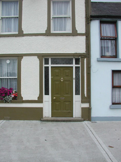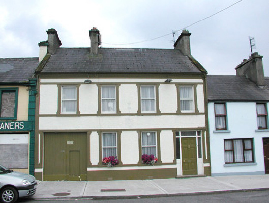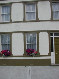 Terraced four-bay two-storey rendered house, built c. 1880. Integral carriage arch to east, entrance door to west. Pitched artificial slate roof, clay ridge tiles, unpainted smooth-rendered corbelled chimneystacks, concrete verge cappings, half-round cast-iron gutters on eaves corbel course, cast-iron downpipe. Painted roughcast walling with smooth-rendered strings and plinth course. Square-headed window openings, painted smooth-rendered lugged-and-kneed surrounds, painted stone sills, painted one-over-one timber sash windows. Square-headed door opening, painted smooth-rendered lugged-and-kneed surround, painted timber door with six raised-and-fielded panels, glazed sidelights and overlight. Square-headed carriage arch, painted smooth-rendered lugged-and-kneed surround, painted vertically-sheeted gates with wicket gate. Street fronted with lower buildings to east and west.
