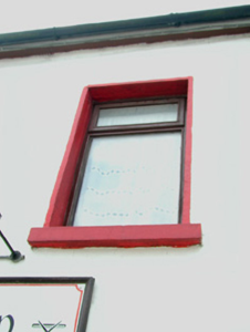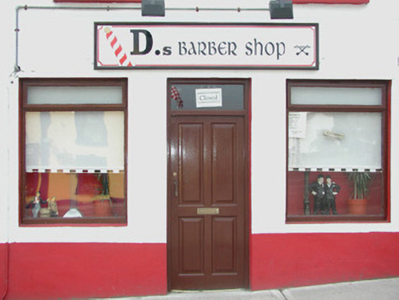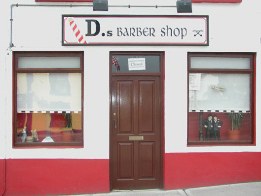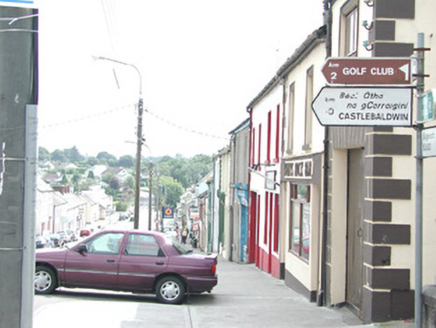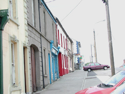 Terraced four-bay two-storey rendered former house, built c. 1880, now in use as barber's shop. Integral carriage arch to south, door to first floor living accommodation to north of arch. Pitched slate roof, clay ridge tiles, unpainted smooth-rendered corbelled chimneystacks, half-round cast-iron gutters on eaves corbel course, cast-iron downpipe. Painted ruled-and-lined smooth-rendered walling, painted quoins and plinth. Square-headed window openings, slightly-projecting smooth-rendered reveals, painted masonry sills, painted timber casement windows c. 1980. Square-headed door openings, hardwood doors each with four panels c. 1980, plain-glazed overlights. Painted timber shop sign c. 1990. Square-headed carriage-arch opening, painted timber vertically-sheeted double doors. Street fronted on incline, continuous roofline to north, step down to slightly-lower building to south.