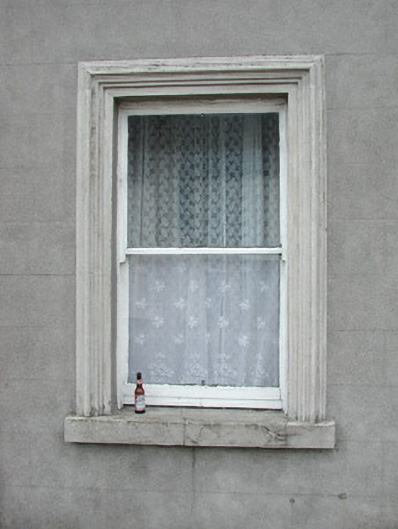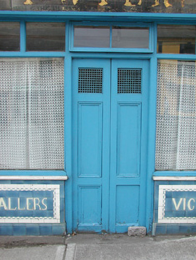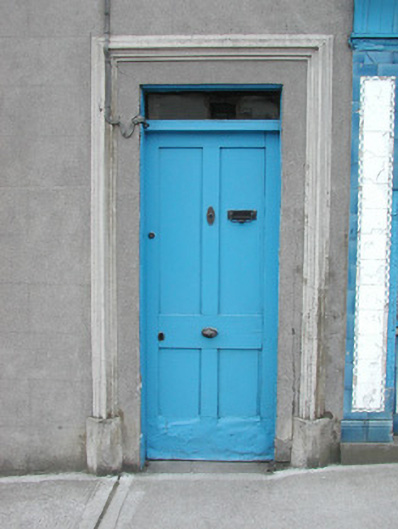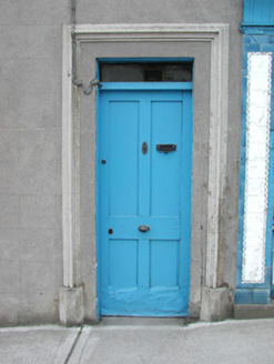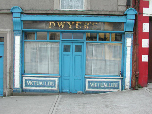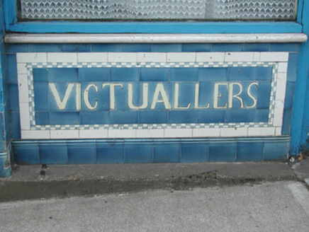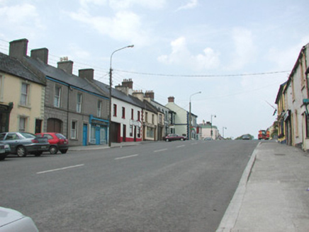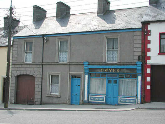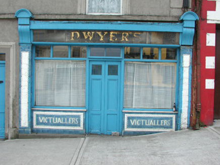 Terraced three-bay two-storey rendered house, built c. 1870, formerly in use as butchers shop. Integral carriage arch to south, entrance to residence in centre, shopfront to north. Pitched slate roof, clay ridge tiles, unpainted smooth-rendered corbelled chimneystacks, half-round cast-iron gutters on painted timber fascia board. Unpainted ruled-and-lined walling, with raised render straight channeled jointed quoins to north and south, moulded sill course to first floor, smooth faced channel-jointed rustication to carriage arch bay. Square-headed window openings with moulded render surrounds, masonry sills, painted one-over-one timber sash windows c. 1870. Painted timber shopfront, encaustic tiling to flanking pilasters, encaustic tiling with integral sign reading 'VICTUALLER' to stall risers, glass-fronted and lettered fascia sign, fluted timber consoles with semi-circular caps, plain-glazed display windows, fixed overlights, painted timber double doors each with three-panels and top panel fitted with gauze screens, top-hung overlight over door. Square-headed entrance door opening to immediate south of shopfront, moulded render surround terminating on canted plinth blocks, plain-glazed overlight, painted timber four-panel door c. 1960. Segmental-headed carriage arch opening, moulded voussoirs, painted vertically-sheeted double doors. Street fronted on inclined site in terrace with continuous roofline.