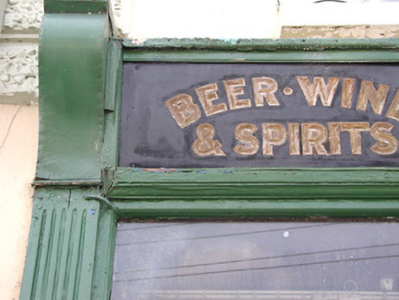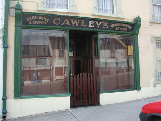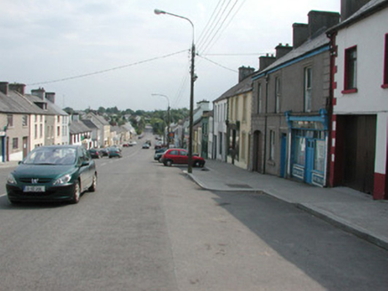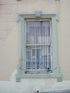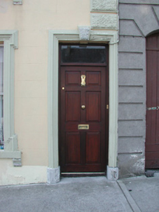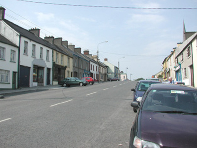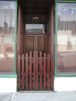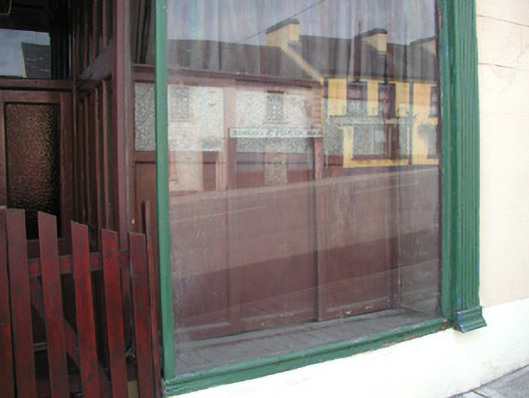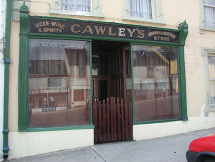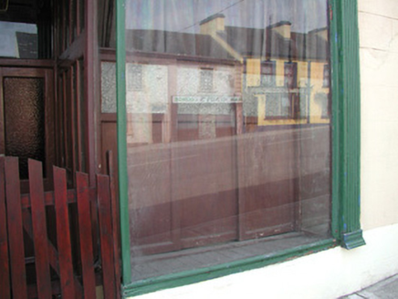 Terraced three-bay two-storey rendered house, built c. 1870. Shopfront to south of elevation. Pitched slate roof, clay ridge tiles, unpainted smooth-rendered corbelled chimneystacks, half-round cast-iron gutters on eaves corbel course. Painted ruled-and-lined smooth-rendered walling, rock-faced margined straight quoins with channeled joints. Square-headed window openings, lugged-and-kneed moulded render surrounds with rock-faced keystone, painted masonry sills on miniature consoles. Painted timber shopfront, fluted pilasters, scrolled consoles, fascia with deeply-carved gilded lettering, square-headed timber frame display windows on stall risers to either side of deeply-recessed central doorway, original timber panelling within display windows, painted half-glazed double doors, plain-glazed overlight. Timber gate at entrance, geometric polychromatic tiling to threshold. Further square-headed door opening to north, moulded render surround, rock-faced keystone, plain-glazed overlight, hardwood timber door with six raised-and-fielded panels c. 1995. Street fronted, on incline, continuous roofline to south, higher building to north.