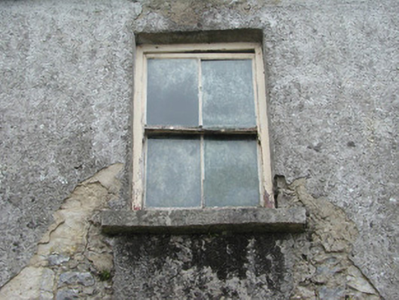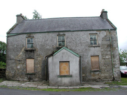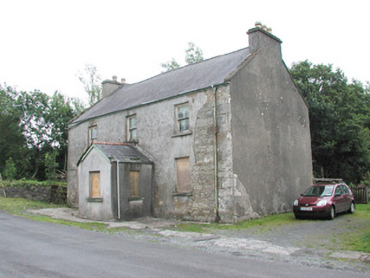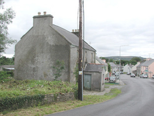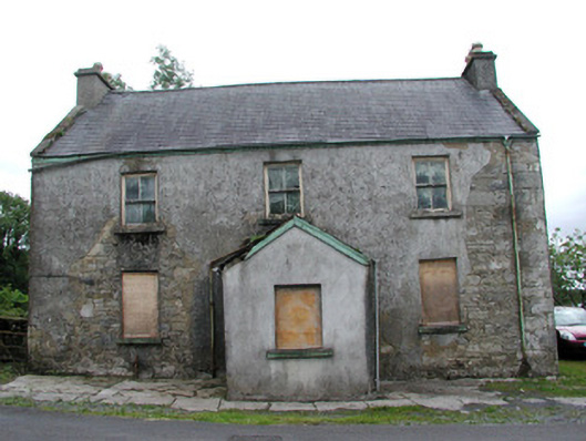 Detached three-bay two-storey rendered former constabulary barracks, built c. 1830, now derelict. Gabled single-storey porch c. 1950 in centre of north (front) elevation. Pitched slate roofs, clay ridge tiles, unpainted smooth-rendered corbelled chimneystacks, concrete verge cappings, half-round cast-iron gutters on eaves corbel course, cast-iron downpipe. Painted timber bargeboards to porch roof, uPVC rainwater goods. Unpainted roughcast walling, smooth-rendered to porch. Square-headed window openings, stone sills, painted two-over-two timber sash windows. Square-headed door opening in porch, painted vertically-sheeted door. Street fronted, rubble stone boundary wall extending to rear from south-west corner.