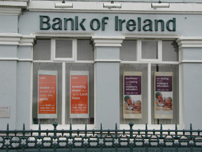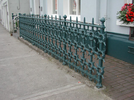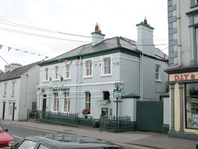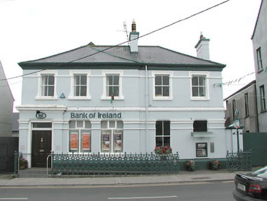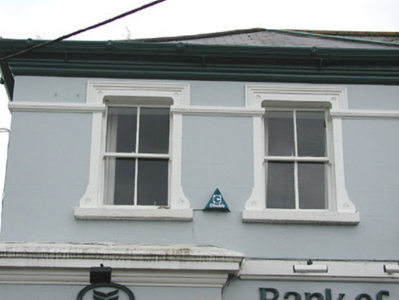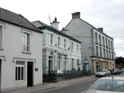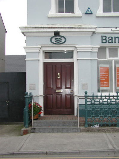 Detached five-bay two-storey rendered bank, built c. 1910. L-plan, three-bay breakfront to east side with forward-projecting porch doorcase to extreme east. Hipped slate roof, clay ridge and hip tiles, painted smooth-rendered chimneystacks, moulded cast-iron gutters embellished with lion's head motifs on moulded render eaves corbel course. Painted smooth-rendered walling, moulded string courses at first floor and window head levels, moulded plinth. Square-headed window openings, painted concrete sills, decorative moulded heads and plain bands to reveals (kneed to breakfront) to first floor, painted two-over-two timber sash windows except two painted timber casement windows to banking hall, ground floor window to west modified to accept cash dispenser. Painted smooth-rendered plain frieze over ground floor windows and door with individually-lettered sign. Square-headed entrance door opening in painted smooth-render, doorcase with flanking pilasters with moulded caps, plain frieze containing bank logo, moulded cornice, plain-glazed overlight, hardwood door with six raised-and-fielded panels c. 1970. Two steps from footpath, small paved area to front bounded by ornate cast-iron railings, painted smooth-rendered gate piers with pyramidal copings to west, painted sheet-metal gates c. 1995, alleyways to east and west sides, taller three-storey building to west, lower two-storey building to east.