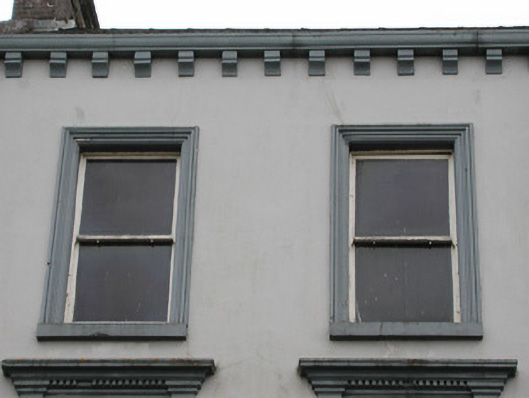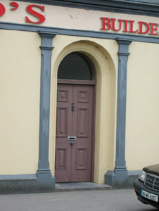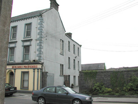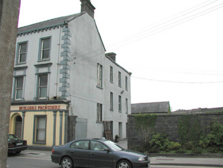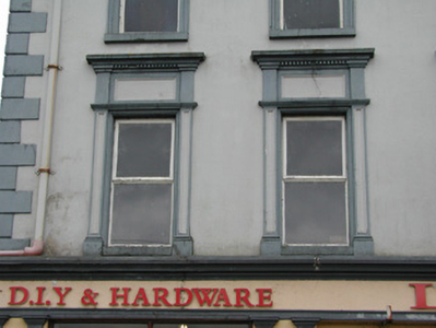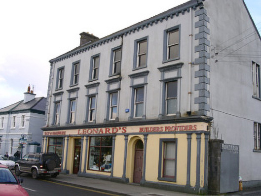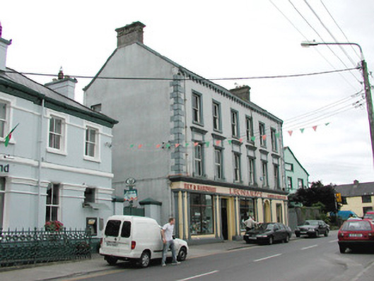 Detached six-bay three-storey rendered shop, built c. 1870, formerly with dwelling over. Shopfront to full width of ground floor, two-storey return to east, three-storey return to west. Pitched slate roof, clay ridge tiles, brick corbelled chimneystacks, concrete verges to gables, moulded cast-iron gutters on moulded corbels, rectangular cast-iron downpipes. Painted smooth-rendered walling, raised quoins. Square-headed window openings, painted stone sills, moulded architraves to second floor, first floor window aedicules with panelled pilasters, plain friezes and moulded dentilled cornices, painted one-over-one timber sash windows. Shopfront with smooth-rendered fascia with raised lettering under moulded cornice, square-headed display windows flanked by paired pilasters with stop-mouldings, simple capitals and bases to either side of openings. Square-headed shop door opening set between paired pilasters to centre, painted timber glazed double doors, plain-glazed overlight. Round-headed double-recessed door opening leading to ground floor hall and dwelling on upper floors, plain-glazed fanlight, painted timber door with six raised-and-fielded panels and central bead. Street fronted, lower two-storey bank to east, gateway leading to yard and rubble stone boundary wall to west.