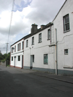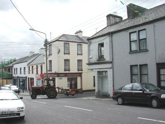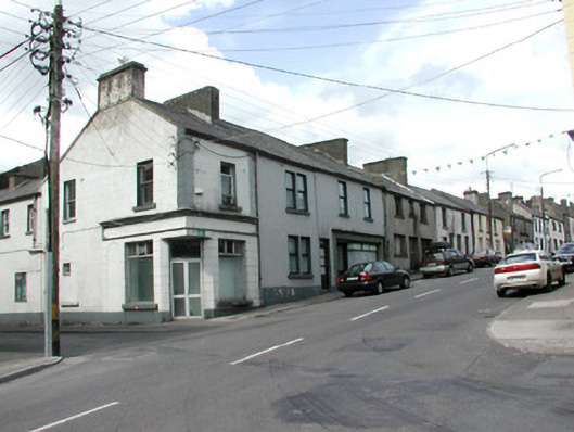 Corner-sited single-bay, two-storey house, built c. 1870, no longer in use. Four-bay two-storey return to west, shopfront returns around corner, splayed corner at ground floor containing shop entrance. Pitched slate roof, clay ridge tiles, painted smooth-rendered corbelled chimneystack, half-round cast-iron gutters. Painted smooth-rendered ruled-and-lined walling, straight quoins. Square-headed window openings, painted stone sills, painted one-over-one timber sash windows. Shopfront with smooth rendered fascia, moulded cornice over, blank slightly-recessed panel with decorative head to north, square-headed window openings, aluminium plate glass display windows. Street fronted, two-storey terrace continues to east.