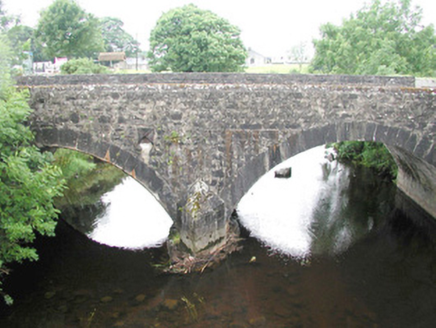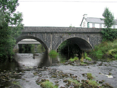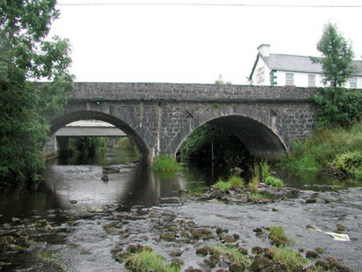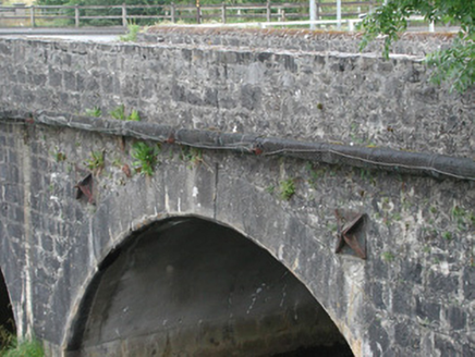 Double-span stone road-over-river bridge, built c. 1850. Coursed squared rubble limestone walling rising to parapets, cast-iron pattress plates securing wrought-iron tie bars. Semi-circular arches, tooled ashlar limestone voussoirs, smooth-rendered soffits. Coursed ashlar limestone pier and abutments, triangular cutwater with pyramidal cap to east. Coursed rubble stone parapets with square coping to west and segmental coping to east. Bitmac twin carriageway. Spans from south-west to north-east over Owengarve River.