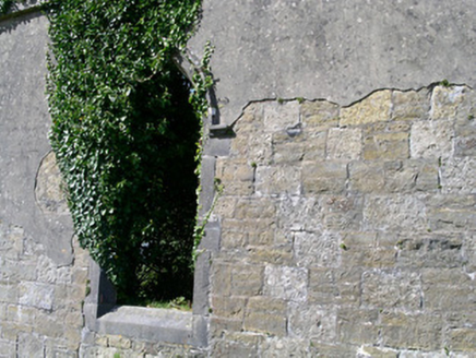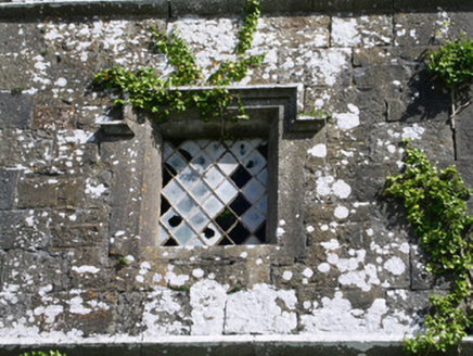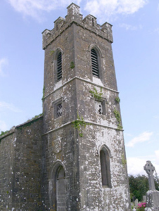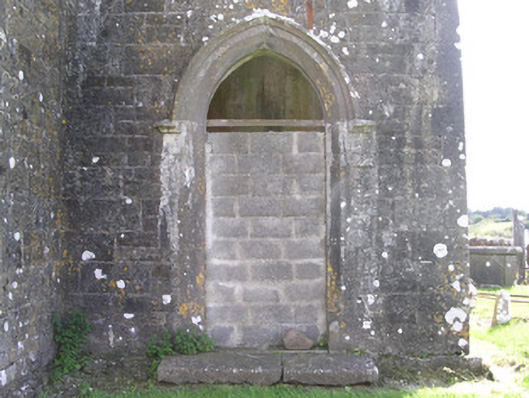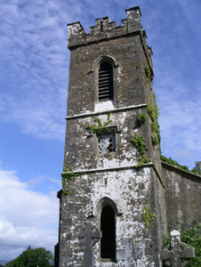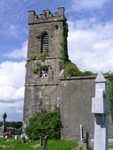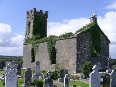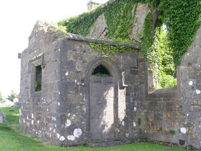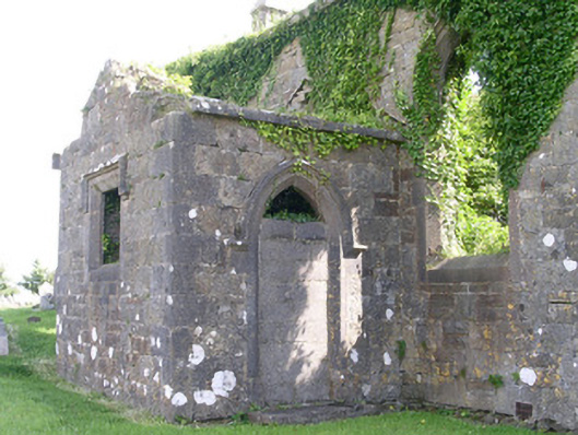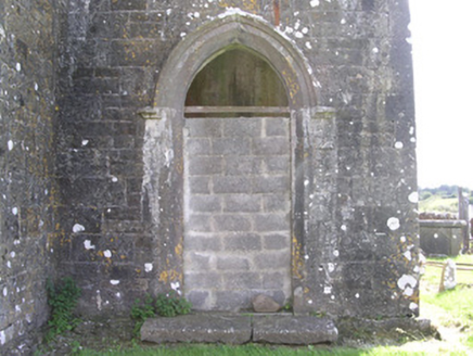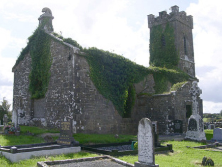 Detached single-cell limestone former church built c. 1830, now ruinous. East-west three-bay nave, three-stage square tower to west, vestry to centre of north elevation of nave. Roofs missing, ashlar verge copings, ashlar corbelled chimneystack to east gable. Coursed squared-rubble walling, unpainted smooth-rendered north elevation tooled ashlar quoins, ashlar eaves corbel course to nave, stepped castellated parapet to tower on corbelled string with ashlar copings, moulded strings between stages to tower, shield plaque above north-facing entrance door at base of tower. Pointed-arch window openings to nave, lancet window ground floor tower, square-headed window openings to second stage tower and vestry, tooled splayed ashlar surrounds, flush sills, hood mouldings to lancet and square windows, glazing missing except diamond-pattern cast-iron fixed lights to second stage tower. Pointed-arch belfry openings to third stage tower, tooled splayed ashlar surrounds, flush sills, hood mouldings, painted timber louvres. Pointed-arch door openings to tower and vestry, tooled splayed ashlar surrounds, hood mouldings,openings built-up. Graveyard surrounding church with wide variety of grave markers, rubble boundary walls, metal gates to north-east, gravel drive leads downhill to main road to north.