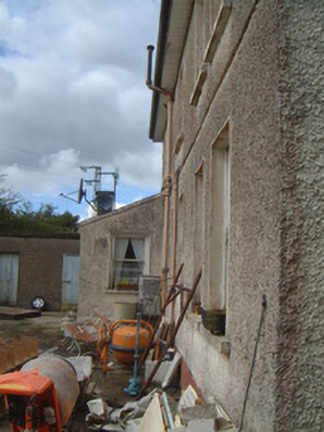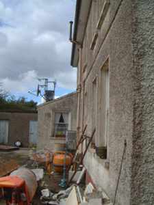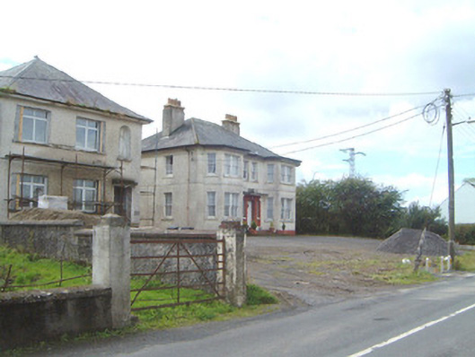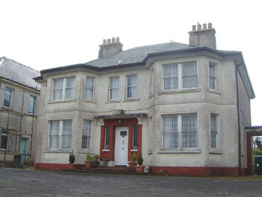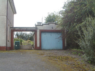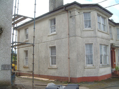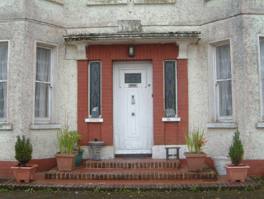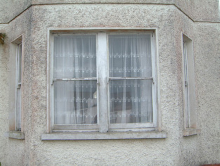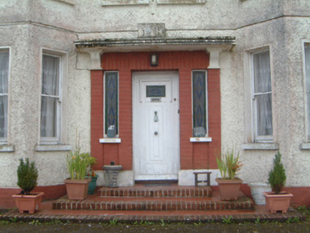 Detached three-bay two-storey rendered house, built c. 1930. Two-storey canted bay windows project from east and west sides of north elevation, single-storey lean-to porch to west of south elevation, single-storey flat-roofed garage to west linked to house by square-headed archway. Hipped artificial slate roof, clay ridge tiles, roughcast chimneystacks with recessed brick soldier course frieze below flat caps, profiled extruded aluminium gutters on painted timber projecting eaves. Painted roughcast walling, brick plinth, first floor string course. Square-headed window openings, slightly-projecting smooth-rendered reveals, painted masonry sills, painted one-over-one timber sash windows, coupled to bays. Square-headed door opening, brick dressings, projecting flat concrete canopy on corbels, square-headed sidelights with leaded-lights with stained glass, painted timber door with concentric panels and leaded light with moulding, brick steps. Set on slightly-elevated site without boundary to road to north, three-bay two-storey house to east.