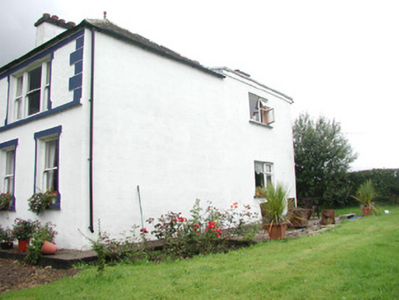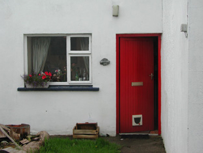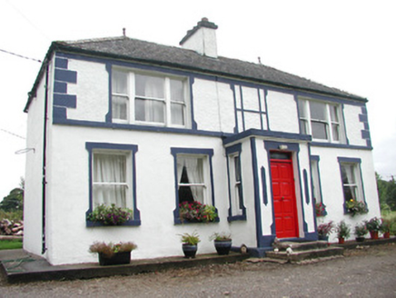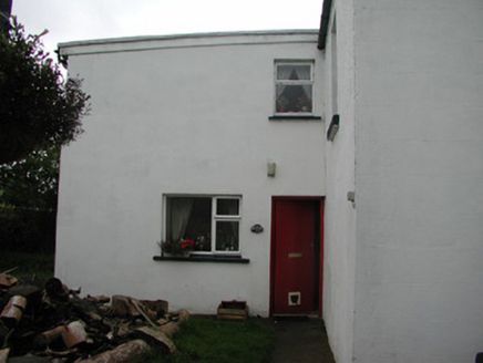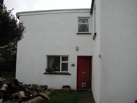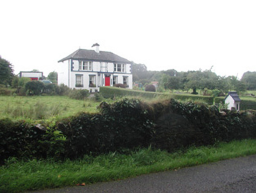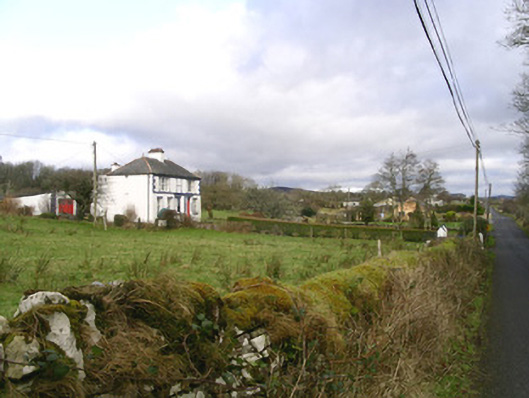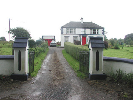 Detached five-bay two-storey rendered former constabulary barracks, built c. 1850, now in use as dwelling. Rectangular plan, single-storey flat-roofed entrance porch projecting from centre of south (front) elevation, two-storey flat-roofed extension to north-east. Hipped slate roof, clay ridge and hip tiles, clay finials terminating ridge, painted roughcast corbelled chimneystack, half-round cast-iron gutters on eaves corbel course. Painted smooth-rendered ruled-and-lined walling to ground floor front elevation and east and west elevations, painted roughcast to first floor front elevation, painted quoins to first floor front elevation, first floor sill course to front elevation. Square-headed window openings, kneed-and-lugged surrounds, painted masonry sills, painted one-over-one timber sash windows, tripartite to first floor. Square-headed door opening in porch, smooth-rendered kneed-and-lugged surround, timber door with eight raised-and-fielded panels, plain-glazed overlight, two masonry steps. Flat-roofed smooth-rendered garage to north-west, gravelled forecourt, fronted by lawn to road to south, painted smooth-rendered masonry quadrant gate sweeps, painted masonry gate piers, chamfered corners, projecting plinths and gabled roll-top caps, steel gates.