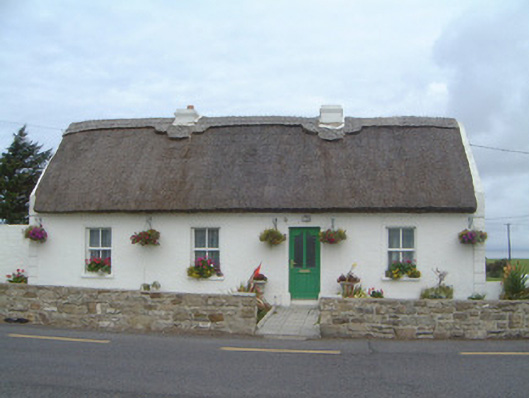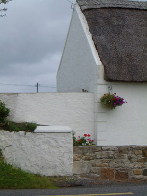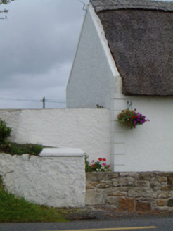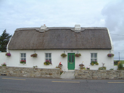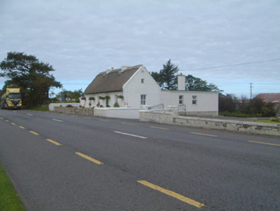 Detached four-bay single-storey thatched house, built c. 1825. Single-storey flat-roofed extension c. 1990 to north (rear). Reed-thatched roof, raised scalloped ridge, squat painted smooth-rendered chimneystacks with stepped capping. Painted roughcast walling, straight channel-jointed quoins, smooth-rendered projecting plinth. Square-headed window openings, simple moulded render surrounds, painted stone sills, painted two-over-two timber sash windows c. 1990. Square-headed entrance door opening, simple moulded render surround, painted timber panelled and half-glazed door c. 1990. Small garden to south, low rubble stone boundary wall to road, farmyard to north, Donegal Bay further to north.