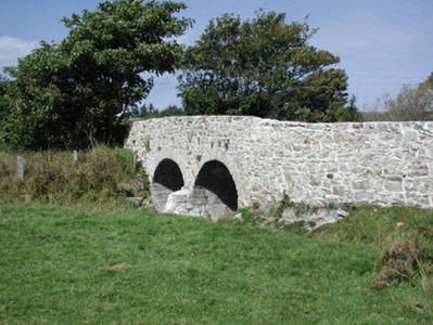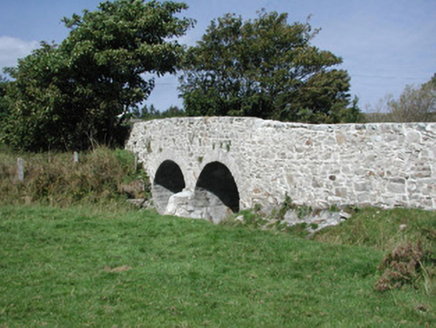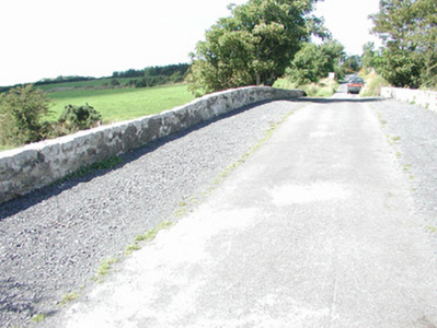Double-span limestone road-over-river bridge, built c. 1830. Uncoursed rubble walling rising uninterrupted to uncapped low parapets. Semi-circular arches, roughly-dressed voussoirs, semi-circular battered cutwaters to both sides. Single carriageway deck, gravelled verges. Spans south-east to north-west over narrow stream. Located in flat scenic landscape.