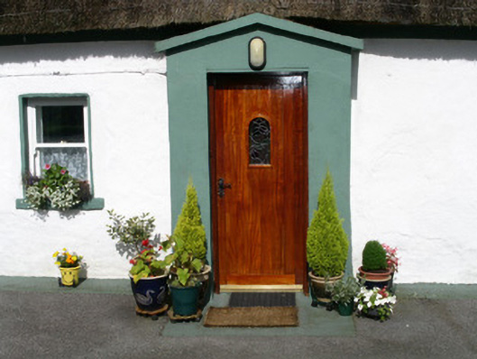 This thatched house has pronounced ridge scalloping which, while not a traditional feature, adds something of the thatcher's individuality to the work. Small sash windows and limewashed walls, with Ben Bulben in the background, make this the quintessential Irish cottage.