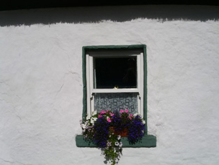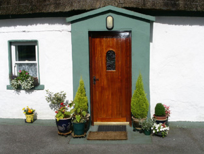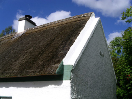 Detached four-bay single-storey thatched dwelling, built c. 1860. Shallow gabled porch projecting from south (front) elevation. Rye straw thatch roof, diamond-patterned scalloped ridge, painted concrete skews, painted smooth-rendered chimneystacks. Limewashed smooth-rendered walling. Square-headed window openings, painted stone sills, painted one-over-one timber sash windows c. 2000. Square-headed door opening, varnished hardwood vertically-sheeted door c. 2000. Bitmac frontage to road, wooded setting, at crossroads.