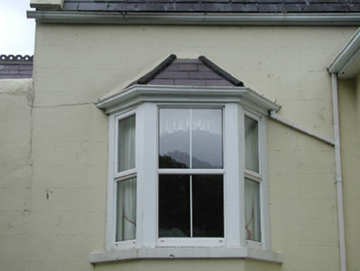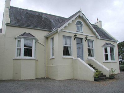 Detached three-bay two-storey over basement with attic rendered house, built c. 1890. Three-bay full-height gable-fronted entrance porch projecting from north (front) elevation, single-storey canted bays to east and west of porch, single storey wing to east. Pitched slate roofs, crested clay ridge tiles, painted smooth-rendered tapered-cap chimneystacks, painted concrete verge copings, painted timber fretwork projecting bargeboards to porch, profiled extruded aluminium gutters at eaves course. Painted ruled-and-lined smooth-rendered walling, raised chamfered plinth to porch, render string course to base of gable to porch. Square-headed window openings, painted masonry sills, uPVC casement windows c. 2000. Round-headed window opening to porch gable, square-profile hood moulding. Square-headed door opening, plain glazed overlight, painted timber door with six raised-and-fielded panels, accessed by flight of stone steps with smooth-rendered flanking balustrade walls. Sea cliffs to rear, fronting onto graveled forecourt, approached by long tree-lined avenue, wrought-iron gates with cast-iron embellishments on replacement piers c. 2000.