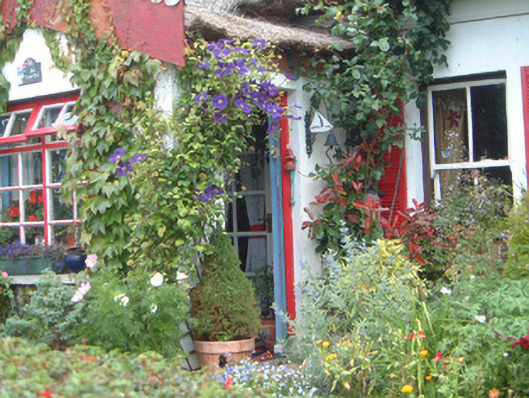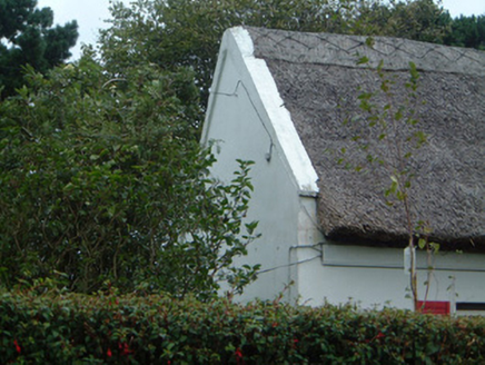 Detached five-bay single-storey thatched house, built c. 1830. Gable-fronted entrance porch projecting to south (front) elevation, three-bay single-storey extension c.1900 to east elevation. Reed thatched roof with raised ridge, shallow thatched roof to porch with deep lead-capped painted timber bargeboards, painted concrete skews, pitched artificial slate roof to extension, brick cobelled chimneystacks. Painted smooth-rendered walling. Square-headed window openings, painted stone sills, painted timber louvred shutters c. 1990, painted two-over-two timber sash windows, painted timber casement window c. 1940 to entrance porch. Square-headed door opening to east side of porch, painted timber door c. 1940 with glazed panels. Set back from road, timber fence, boundary hedges, rubble stone gate piers to south.