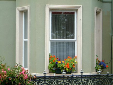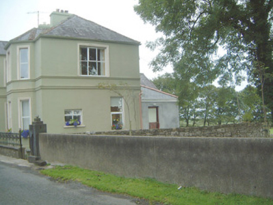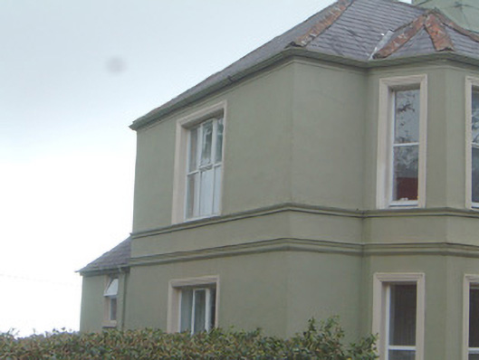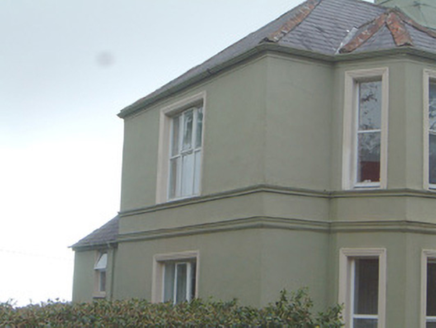 Detached three-bay two-storey rendered house, built c. 1920. Central two-storey gable-fronted projecting entrance bay on south elevation with two-storey canted bay windows to either side, two-bay single-storey gabled return at north-west, single-storey hipped-roof extension c. 2000 to north-east. Hipped slate roof, clay ridge and hip tiles, painted smooth-rendered chimneystacks with stepped capping, profiled cast-iron gutters on moulded eaves course. Painted smooth-rendered walling, moulded string course and sill course, projecting plinth. Square-headed window openings, moulded architraves, painted masonry sills, painted timber casement windows c. 1985. Square-headed entrance door opening, moulded architrave, painted timber panelled door, panelled sidelight, overlight with coloured patterned glass all c. 1985. Set back from road in grounds, decorative panelled cast-iron gates and railings on unpainted smooth-rendered plinth wall to south, overlooks sea to north. Complex of rubble limestone outbuildings c. 1860 across road to south-east including former single-storey dwelling, pitched slate roofs, segmental-headed carriage openings to east range, wrought-iron gates.