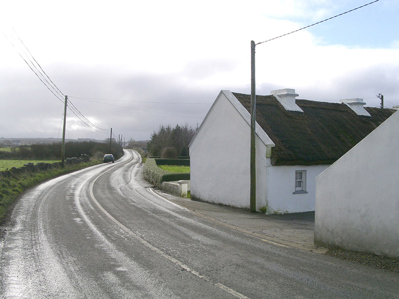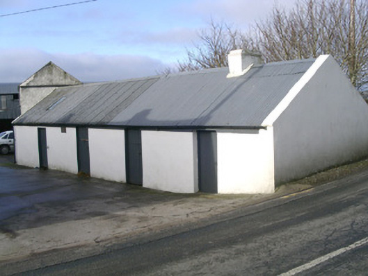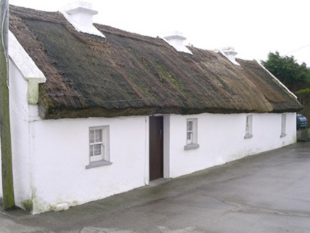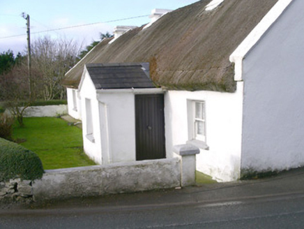Detached five-bay single-storey thatched house, built c. 1880. Single-storey gabled entrance porch. Thatched roof with raised ridge, concrete verges, painted smooth-rendered chimneystacks with mortar aprons. Pitched slate roof to porch, clay ridge tiles, extruded profiled aluminium gutters. Lime-washed smooth-rendered walling. Square-headed window openings, smooth-render slightly-projecting reveals, painted stone sills, painted two-over-two timber sash windows. Square-headed door openings, painted vertically-sheeted timber doors. Set perpendicular to road, small garden to west bounded by hedge and lime-washed dry stone wall, various outbuildings to east with pitched corrugated-iron roof to stables and pitched slate roof to hay-loft accessed by external flight of stone steps.