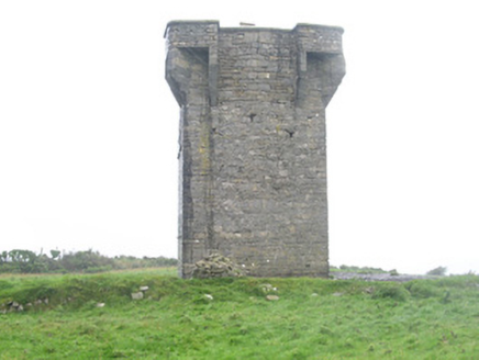 Detached two-storey stone signal tower, built c. 1805, with later work at parapet level c. 1850. Square on plan with slightly V-shaped south elevation, corbelled bartizans to south-east and south-west corners, corbelled 'garderobe' to centre of north elevation. Rubble stone walling, ashlar stone copings to parapets. Square-headed window openings to north, east and west elevations, ashlar stone dressings, stone sills, windows missing. Entrance missing but assumed to be on east elevation. Both internal floor structures missing. Sited on promontory overlooking Sligo Bay to the east.