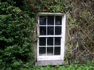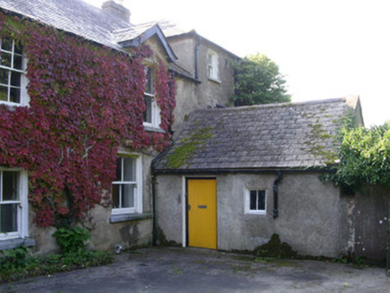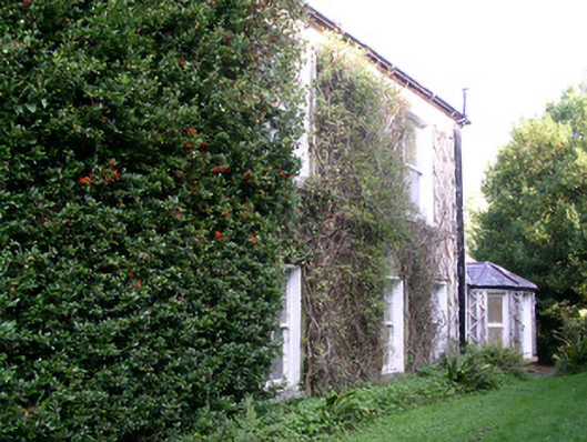 Detached three-bay two-storey over basement rendered house, built c. 1860. Rectangular plan to main house, two-storey return to north-east, single-storey garden room to north end of north-east wing with canted bay, one-and-a-half storey return to north-west, single-storey wing to west gable containing rear entrance. Hipped and pitched slate roofs, clay ridge tiles, brick chimneystacks with stepped cappiing and yellow clay pots c. 1995, gabled dormer with painted timber barges to north-west wing, half-round cast-iron gutters at eaves course, cast-iron down pipes. Unpainted roughcast walling. Square-headed window openings, painted smooth-rendered slightly projecting reveals, dressed stone sills, painted one-over-one timber sash windows, six-over-six to north-east wing, two-over-two to north-west wing. Round-headed main entrance door opening, painted, moulded smooth-rendered surround, painted timber double doors each with single oblong raised-and-fielded panel, plain-glazed fanlight, limestone steps with flanking walls curving outwards to bull nose. Driveway and lawn, gravelled paths, hooped wrought-iron gate on cast-iron posts, wooded setting.