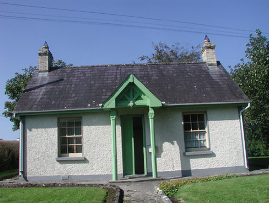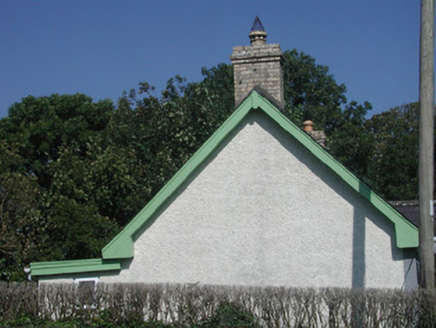 Detached three-bay single-storey rendered former gate lodge, built c. 1850, now in use as private dwelling. Gable-fronted entrance porch supported on carved timber columns to central bay on east (front) elevation, single-storey lean-to extension to west (rear) c. 1990. Pitched slate roof, clay ridge tiles, yellow brick chimneystacks with stepped capping, painted timber projecting eaves fascia and soffit, painted timber projecting barge-boards, uPVC rainwater goods. Painted roughcast walling, smooth-rendered margins at corners, smooth-rendered plinth. Square-headed window openings, smooth-rendered slightly-projecting reveals, painted stone sills, painted six-over-six timber sash windows. Square-headed door opening, painted timber double doors each with full-height plain panel. Set back from road in grounds, central concrete path with lawn to either side, entrance gateway to north-east with octagonal cut limestone gate piers and mild steel gates.