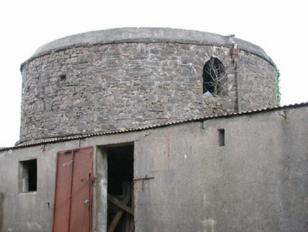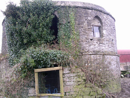 Detached stone tower, built c. 1840. Rubble uncoursed limestone walling stepping out at lower stage, square profile strings at first floor and roof, stone external staircase. Single-storey lean-to outbuildings built around base. Flat roof structure not visible. Pointed-arch window openings, windows missing. Set in farmyard.