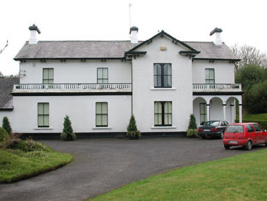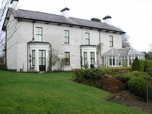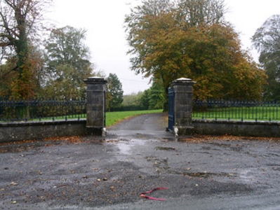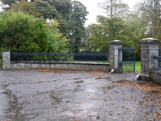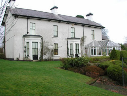 Detached three-bay two-storey rendered house, built c. 1870. Ground floor together with two-storey gabled second end bay from west end of front (north) elevation projecting forward, forming a balcony to first floor rooms at either side of two storey projecting bay and an open porch at ground floor level to west of two-storey projecting bay. Single bay single-storey extension to east. Pitched slate roof, clay ridge tiles, painted smooth-rendered corbelled chimneystacks with clay pots, projecting open-bed pedimented timber eaves to projecting two-storey bay carried on paired brackets, cast-iron gutters on overhanging eaves on paired brackets. Painted smooth-rendered ruled-and-lined walling. Square-headed window openings, stone sills, painted two-over-two timber sash windows to front elevation, with two-over-two coupled sash windows to two-storey projecting bay. Square-headed door opening, painted double panelled timber doors, tiled floor to open porch with three chamfered square profile columns set on stone plinths, moulded cornice carrying floor to balcony above. Macadamed area to front, with lawns and large garden to south. Freestanding stone gate screen to main north entrance to house, built c. 1860. Central carriageway flanked by quadrant sweeps. Tooled coursed ashlar limestone plinth walls to sweeps, segmental-topped copings, wrought-iron railings with cast-iron embellishments. Tooled coursed ashlar limestone piers to gates end of sweep walls, moulded plinths, fluted frieze, moulded cornice, pyramid-topped cap. Squared and coursed rubble stone end piers, pyramidal cap stones. Pair of wrought-iron gates with cast-iron embellishments, cylindrical carriage wheel deflectors, bitmac driveway, cattle-grid. Fronting main road.